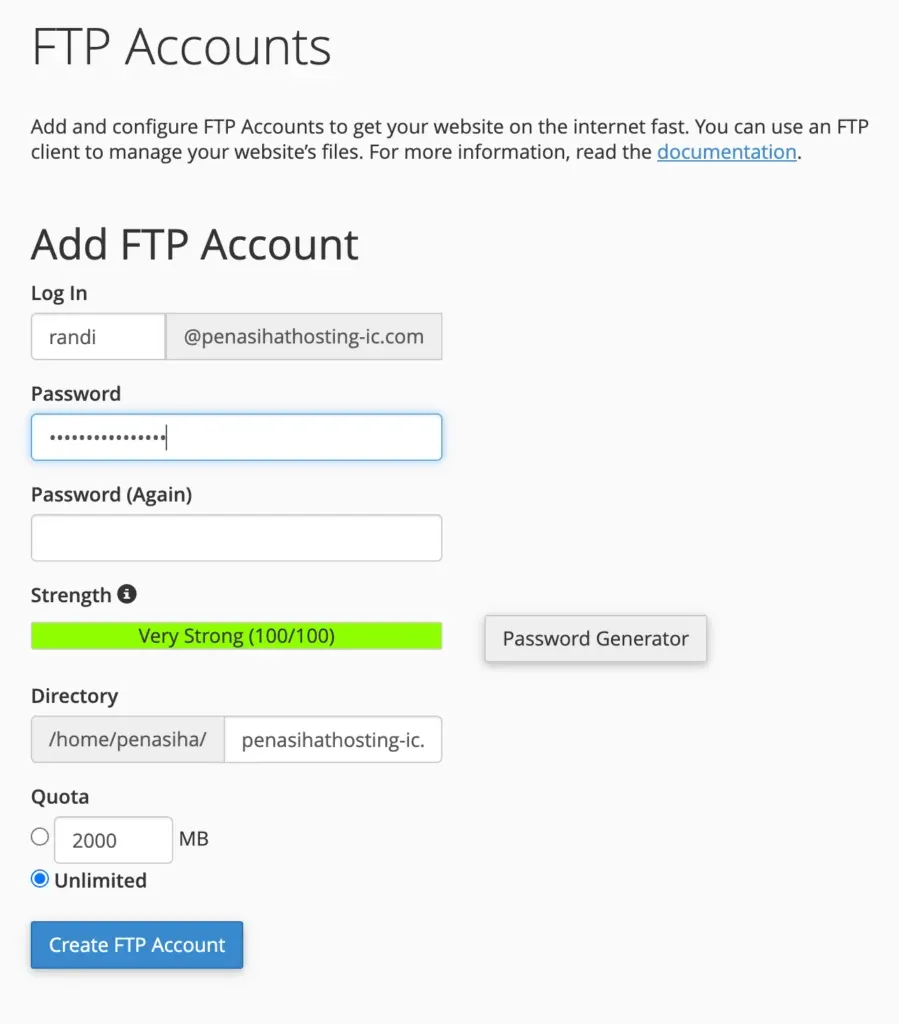 Directory: Kolom “Directory” disini maksudnya adalah akses tingkat tertinggi FTP Account baru yang Anda buat, katakanlah Anda memasukkan public_html pada kolom “directory”, itu artinya FTP Account yang Anda buat memiliki akses ke directory /home/$user/public_html hingga ke sub-directoriesnya.