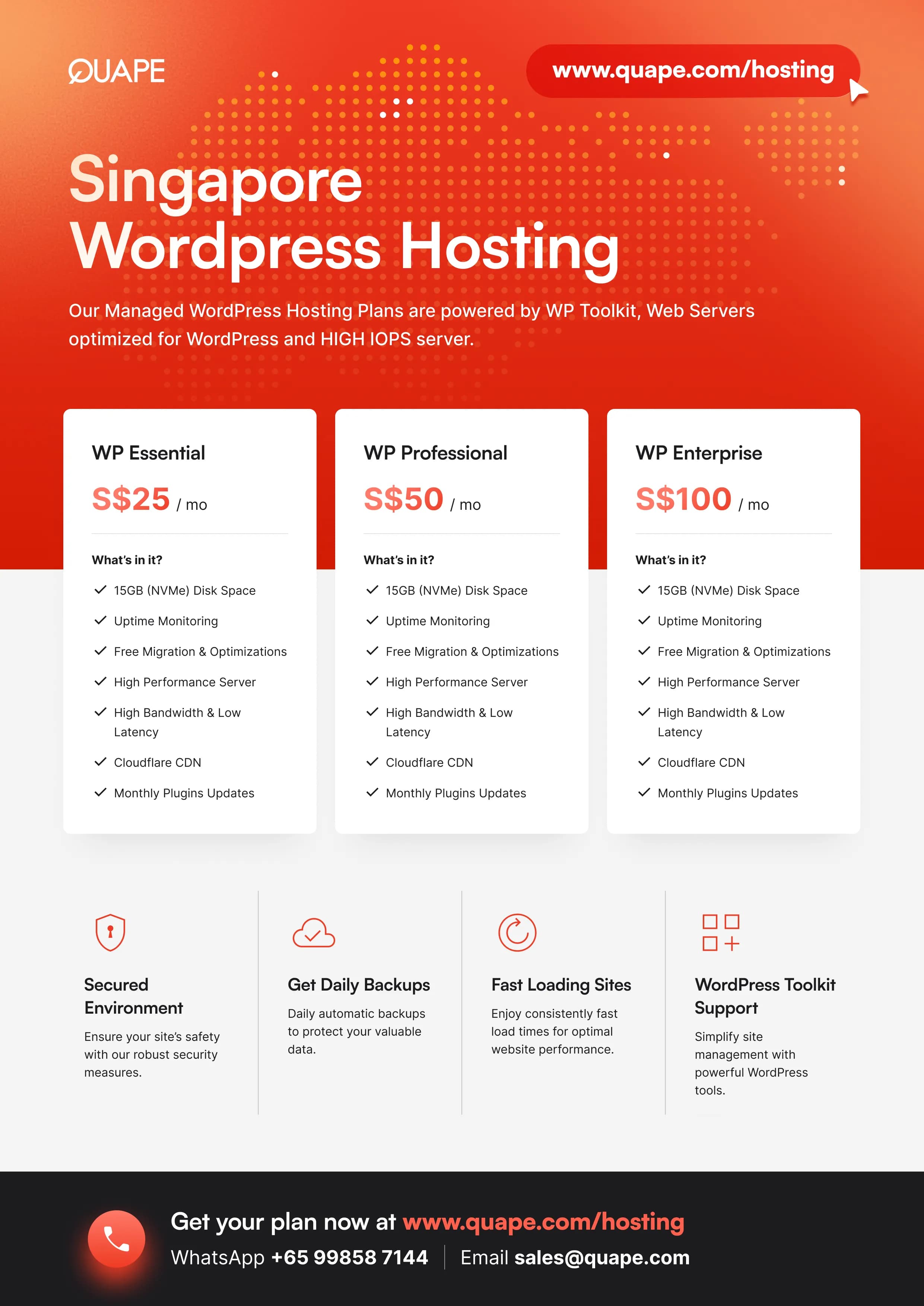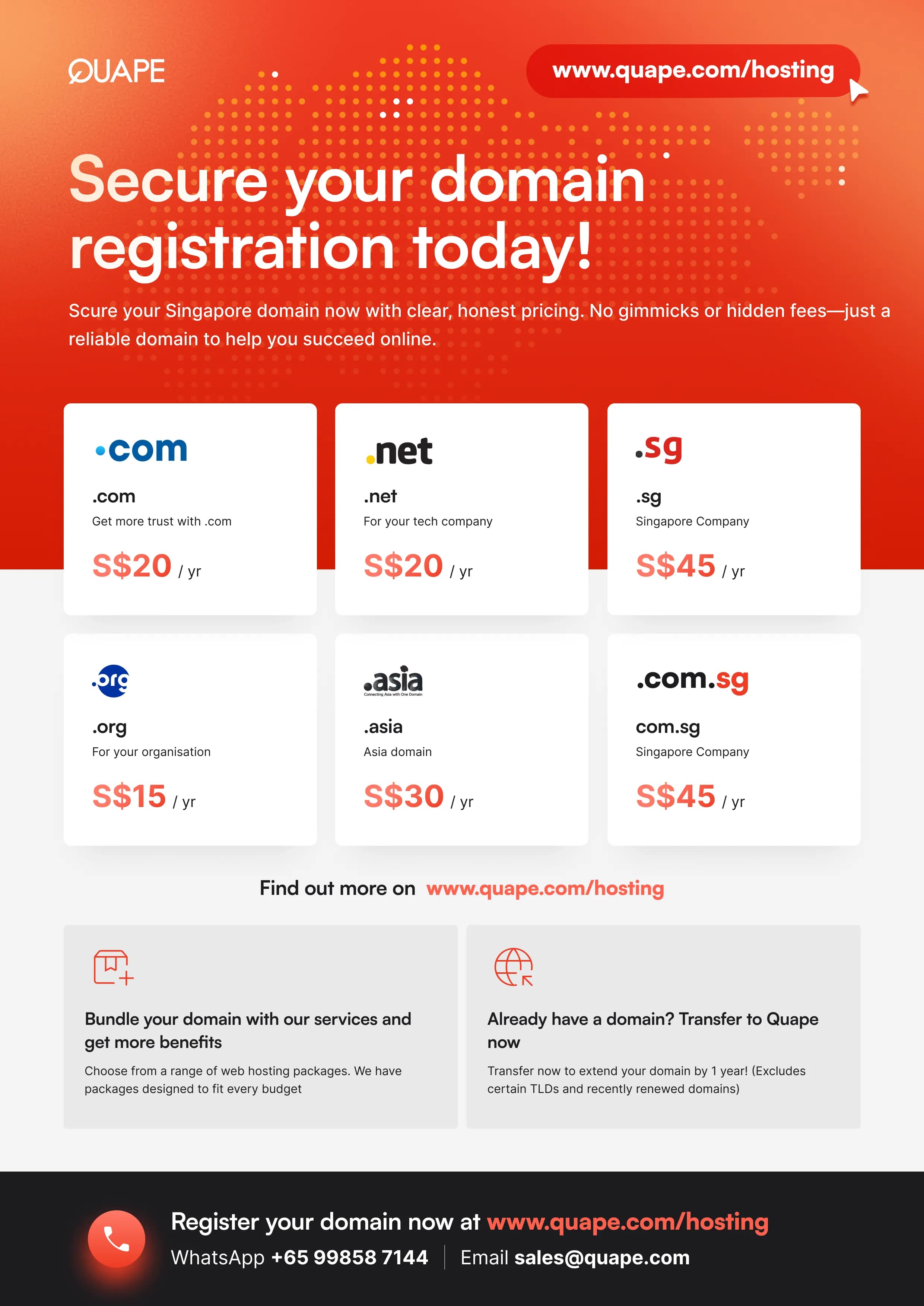 Quape adalah penyedia layanan web design dan hosting terpercaya yang berlokasi di Singapore. Didirikan pada tahun 2006, Quape telah menjadi pioneer dalam industri web design dan hosting di Singapore dengan mengelola infrastruktur sendiri untuk memberikan solusi yang seamless dan terintegrasi bagi klien. Dengan tim lebih dari 10 experienced full-stack developers, Quape bangga mempertahankan kehadiran yang kuat di Singapore dan Vietnam. Mereka menawarkan berbagai layanan hosting dari shared hostin...